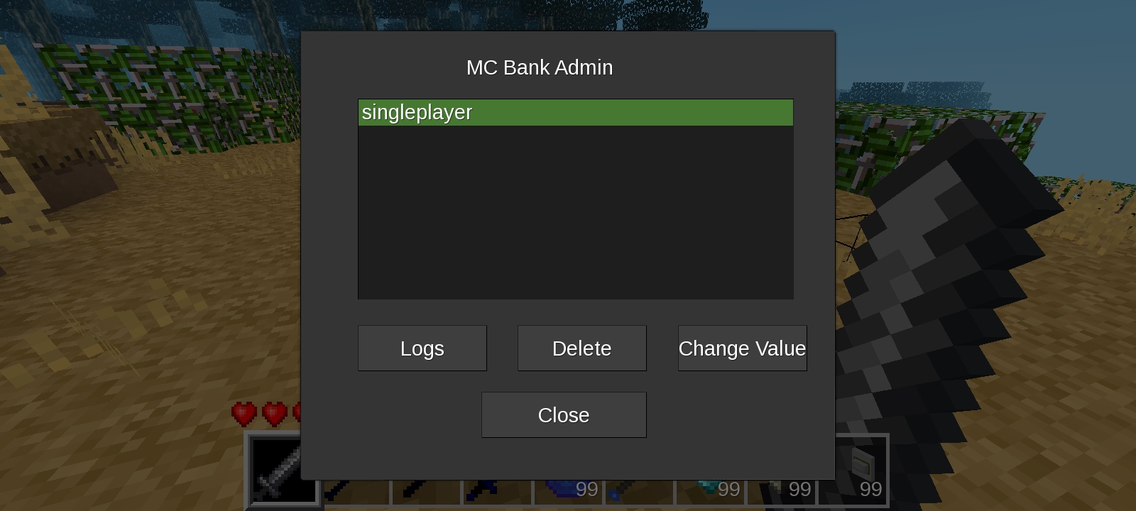 /mcbank_admin opening the administration settings of MC Bank (only feature for this command currently is "delete account" of a selected player)